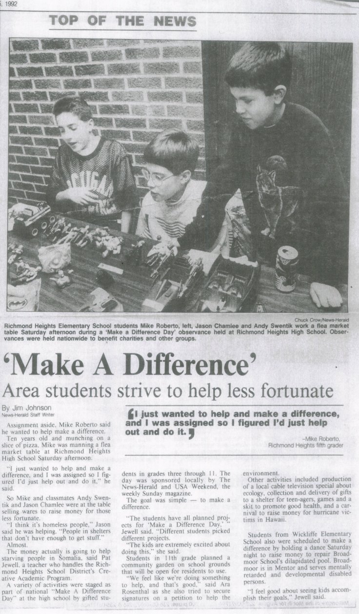 A few weeks ago, my mom was rummaging through some old stuff, where she happened upon an article from the News Herald. It was an article about volunteering, with my picture alongside childhood best friend Jason and our buddy Andy.