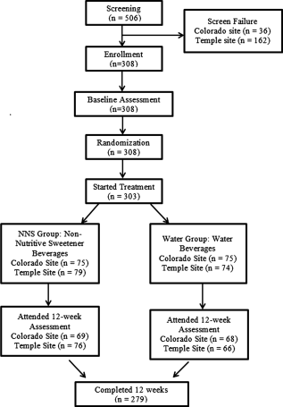 303 participants were selected and placed into a water group or an NNS Group (non-nutritive sweetener -- diet sodas and the like),