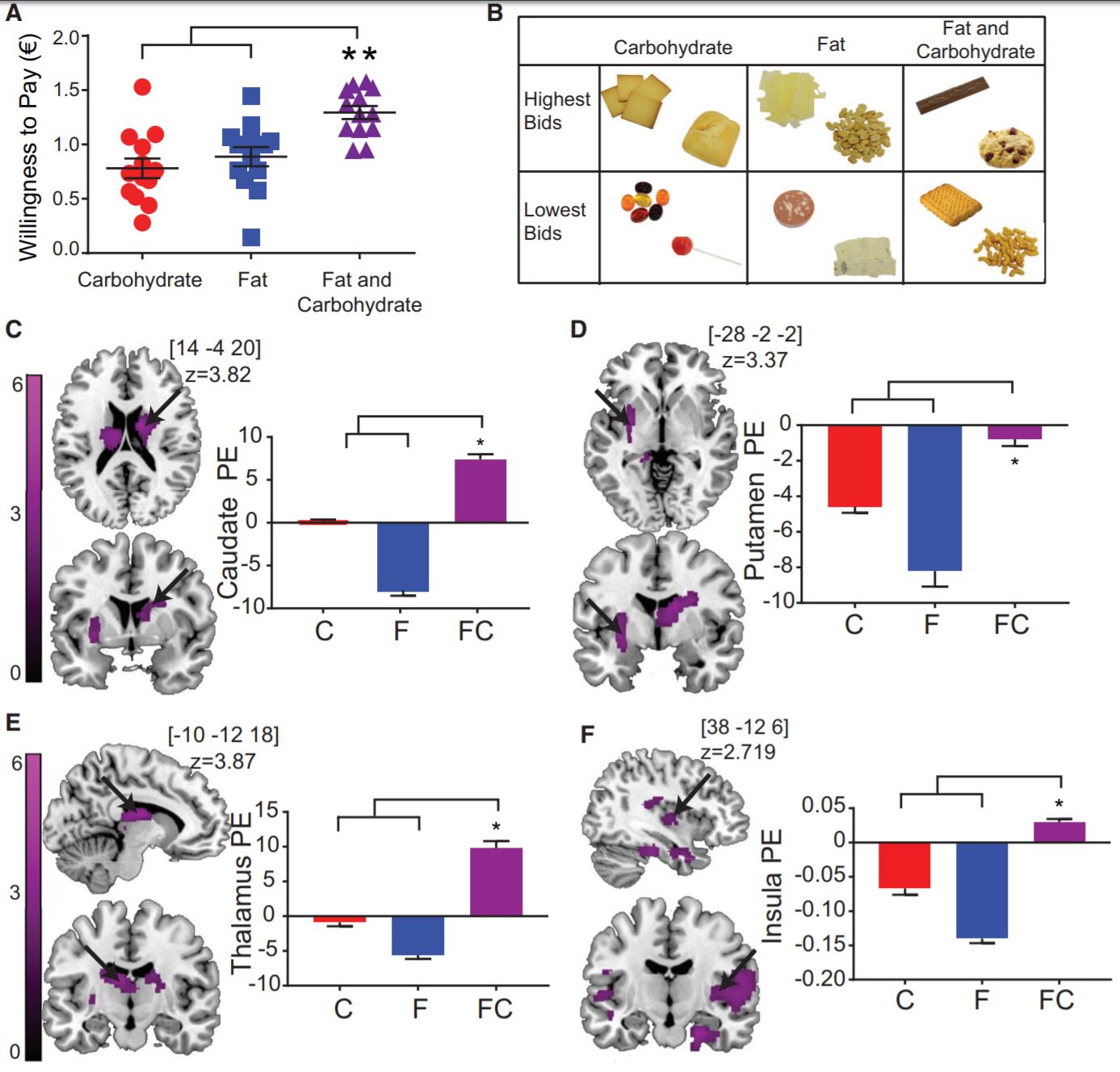 Across the board, participants’ “reward circuits” were more active when bidding on the fat and carbohydrate combined food item. One possibility is that the “postingestive signal” (which conveys information about the nutritive value of fat) is successfully integrated with visual information about foods to determine caloric value, whereas the value of carbohydrates may stem from factors such as flavor or the food’s visual presentation.[1]